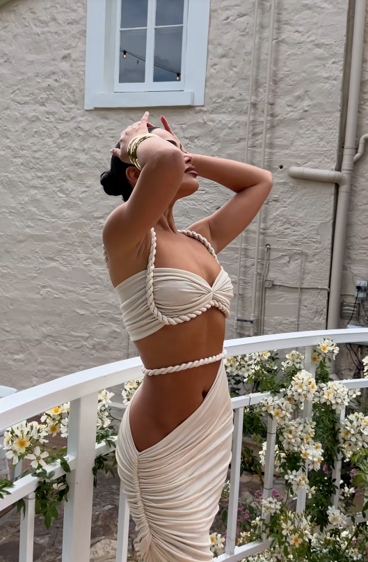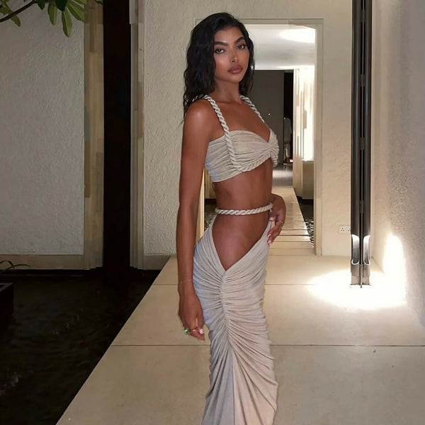 O top meia-taça valoriza o busto com sustentação delicada, enquanto as tiras cruzadas na cintura destacam a silhueta e criam um efeito visual moderno. A saia longa com caimento suave acompanha o movimento do corpo, trazendo leveza e sofisticação ao visual.